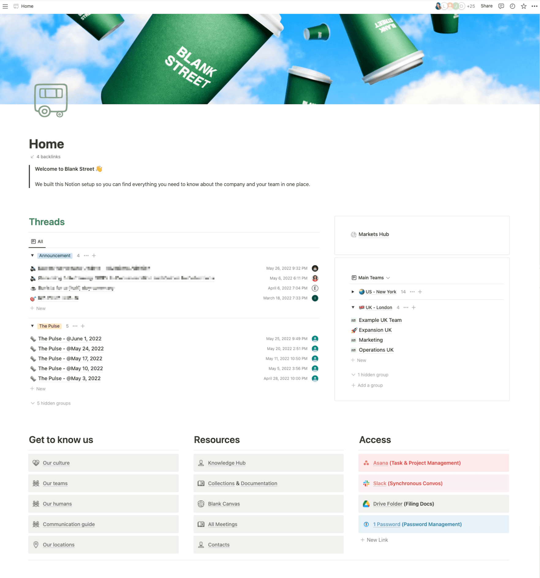 Blank Street's leadership team wanted to triple their business over six months, so they needed a solution that allowed new employees to onboard with Notion and be properly trained to use the workspace. Everyone on the team needed to know exactly where and how to create docs to increase the speed of opening new locations and training baristas.