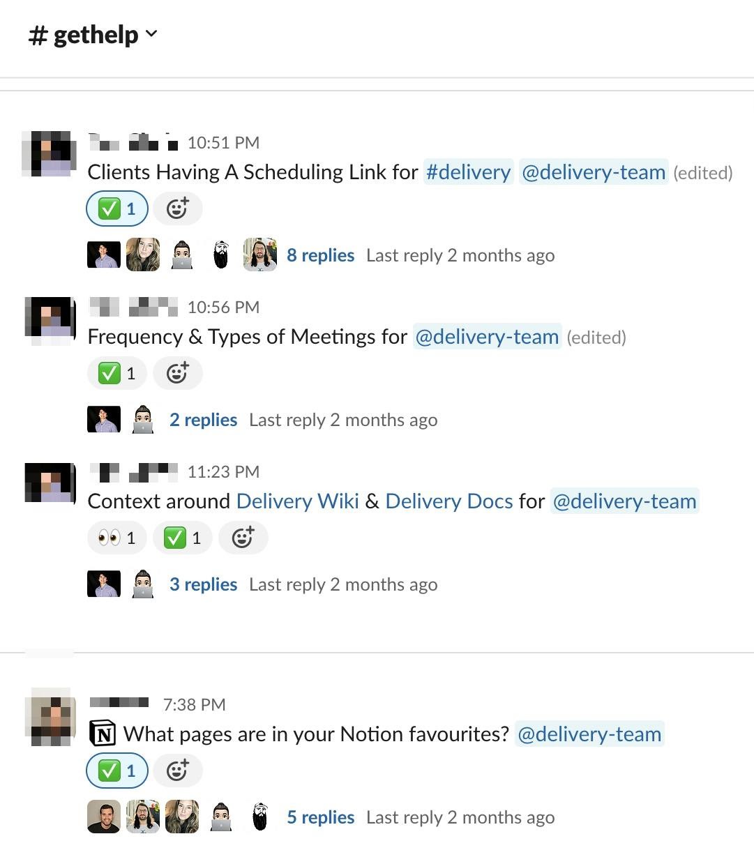 We've also set up a special Slack channel called #gethelp. It's like a virtual safety net where new team members can ask any questions to the whole team, so anyone can jump in to lend a hand. This collaborative vibe not only makes us stronger as a team but also informs our Chief of Staff that there are still some fuzzy parts in our onboarding process that could be improved. We also use a to inform the team that the question has been answered.